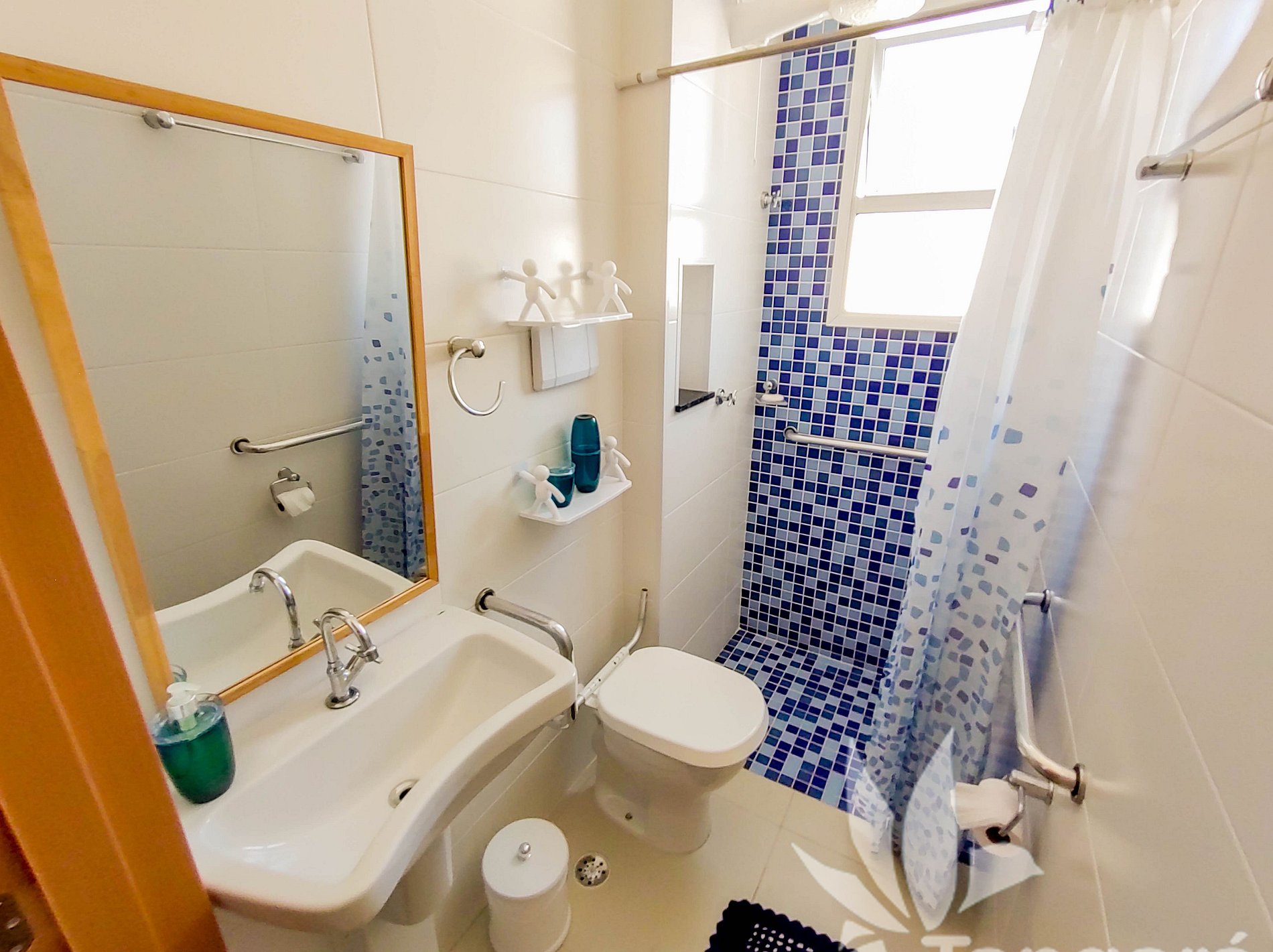 * banheiro social adaptado com barras de apoio e espaço para mobilidade (temos disponível o assento para banho);