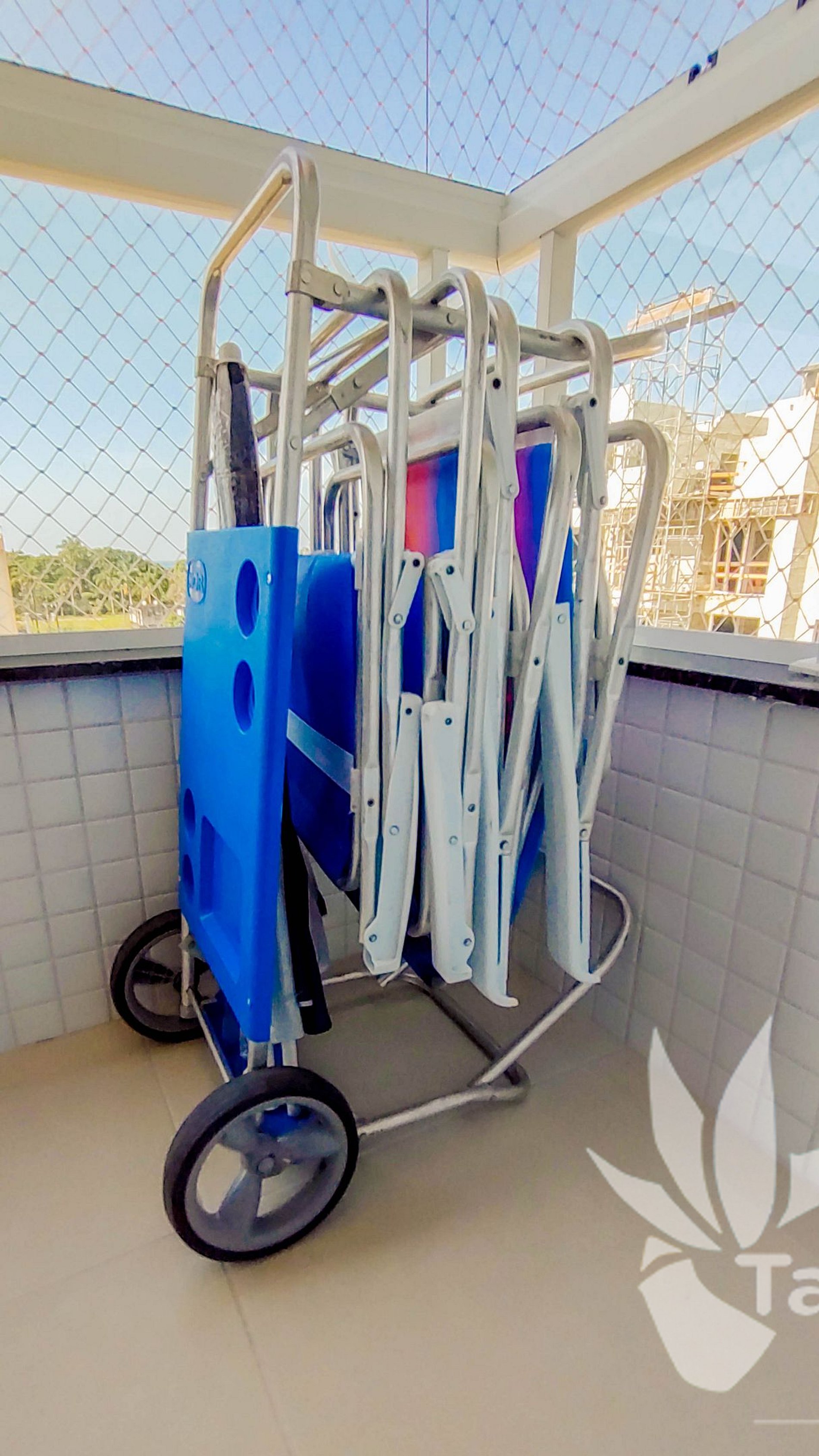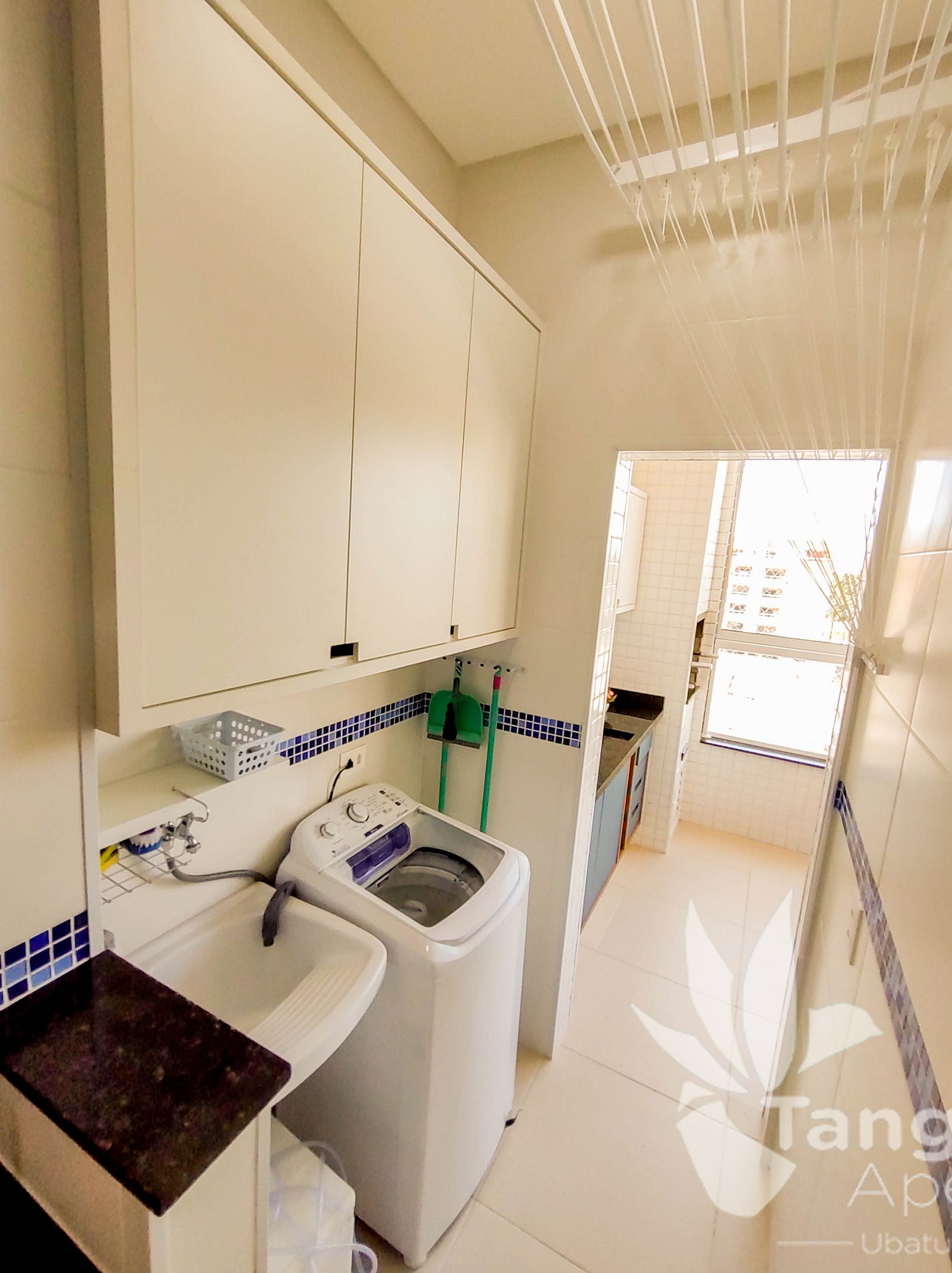 * área de serviço com varal de hastes independentes e máquina de lavar roupas;