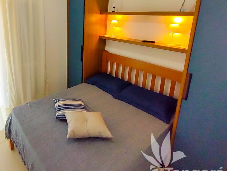 - Suíte com cama de casal e porta balcão para a sacada.