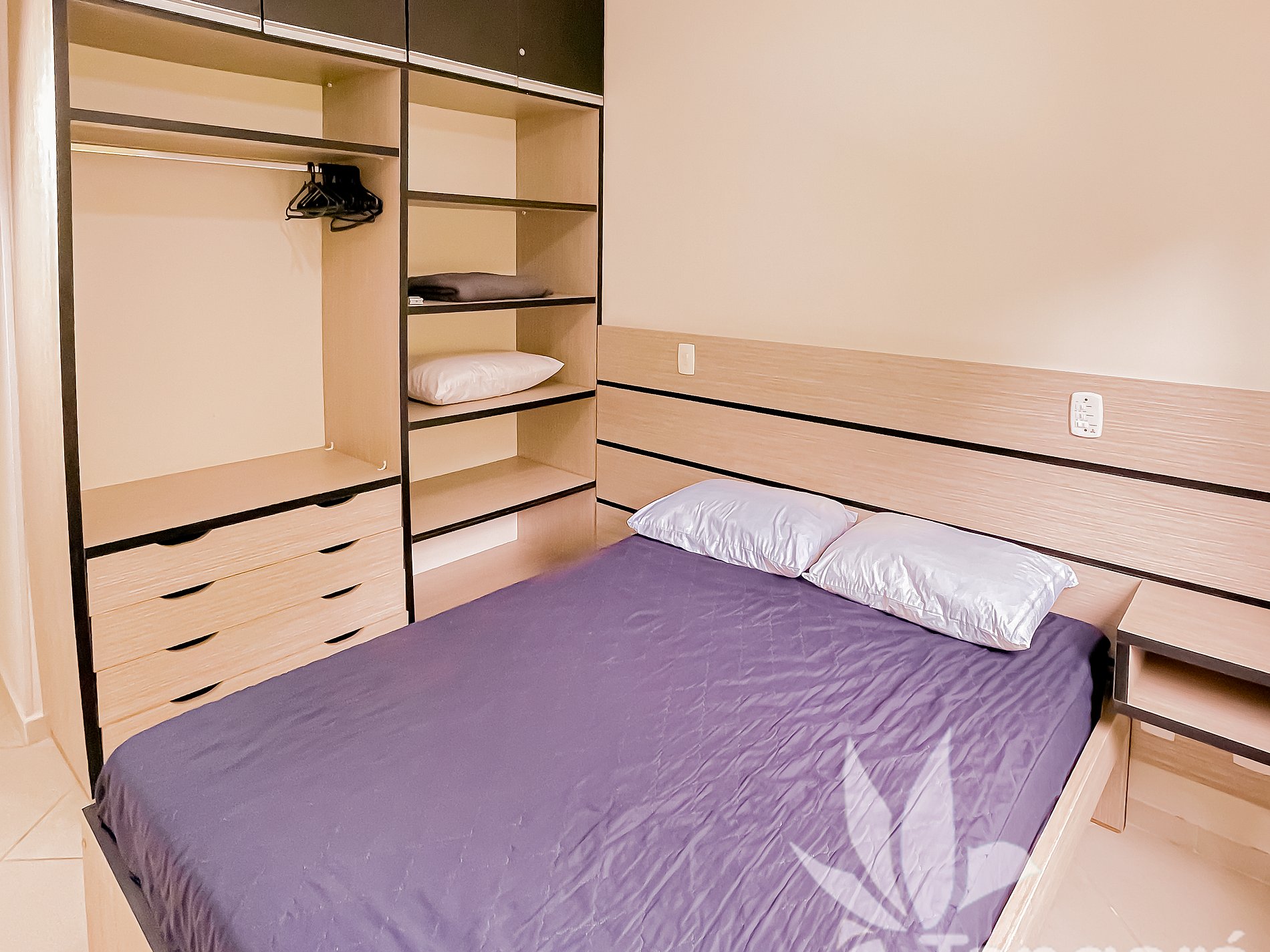 ► Suíte com cama de casal e armários planejados.