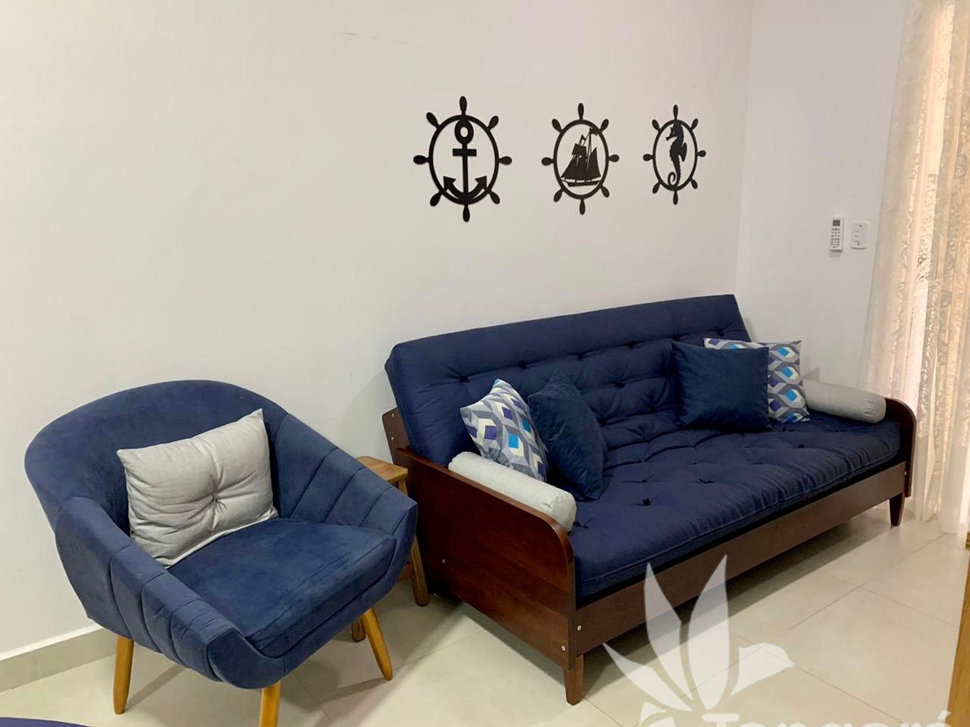 - Sala com sofá futon (pode ser extendido, ficando do tamanho de uma cama de casal);